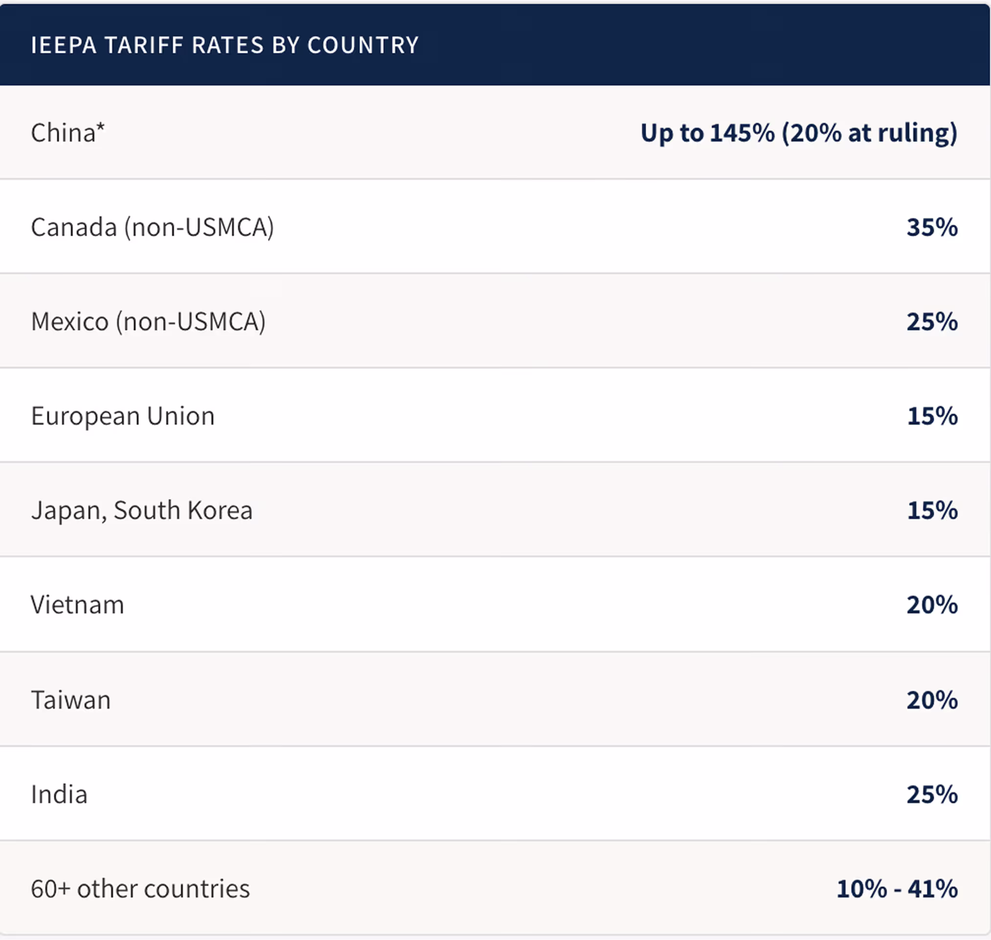These tariffs cover imports from China, Canada, Mexico, the EU, Japan, South Korea, Vietnam, Taiwan, India, Brazil, and 50+ additional countries.